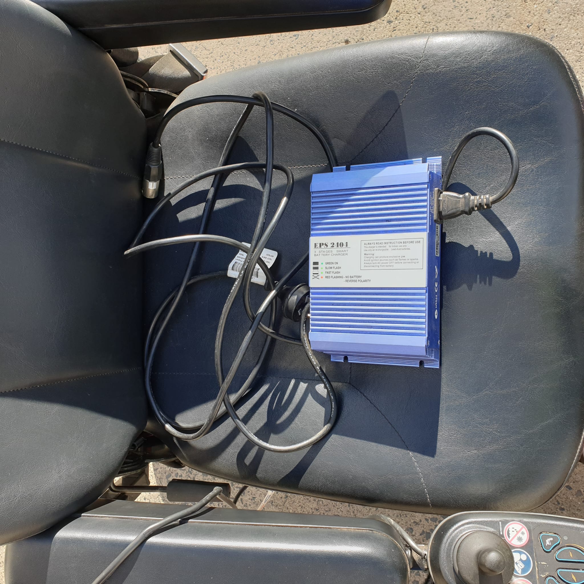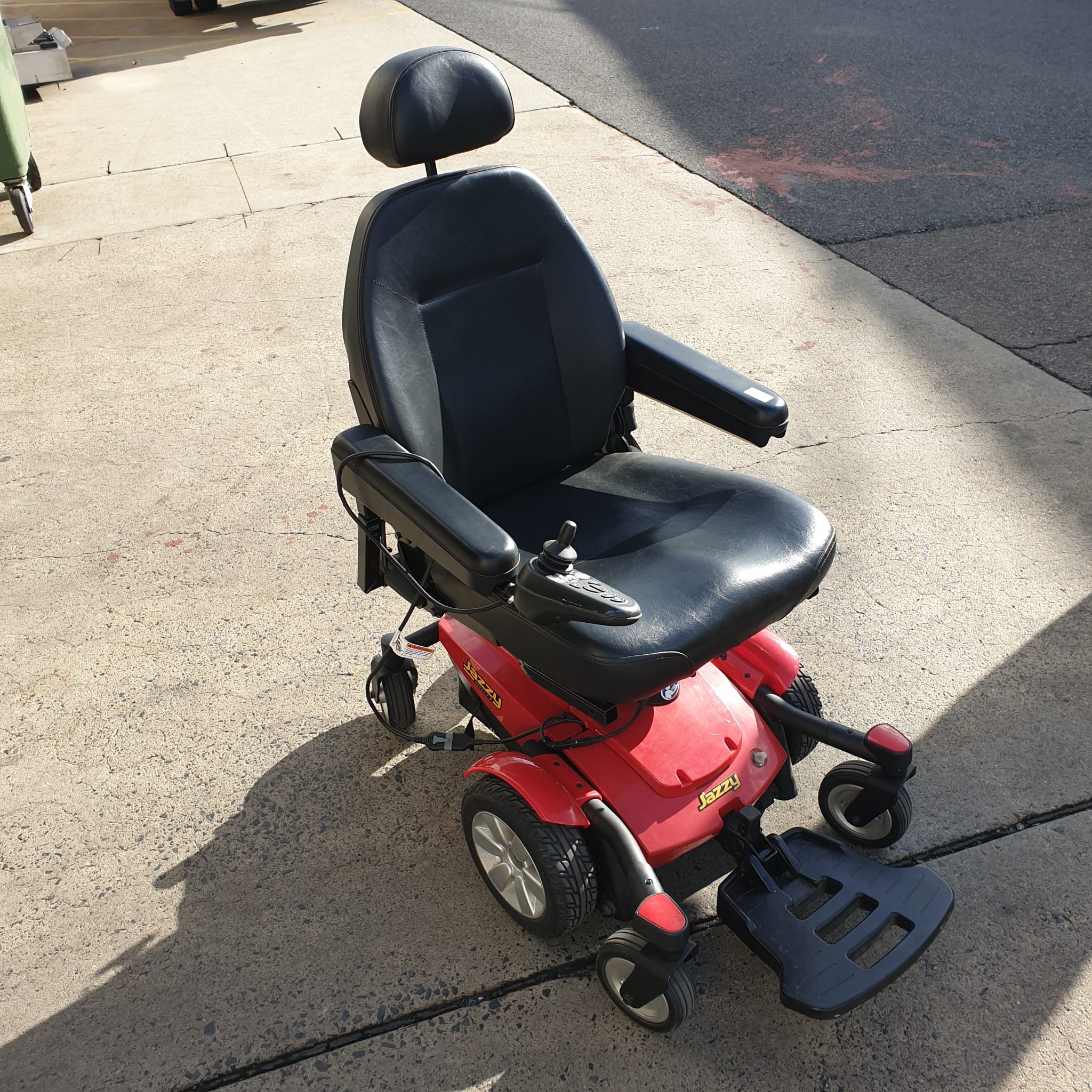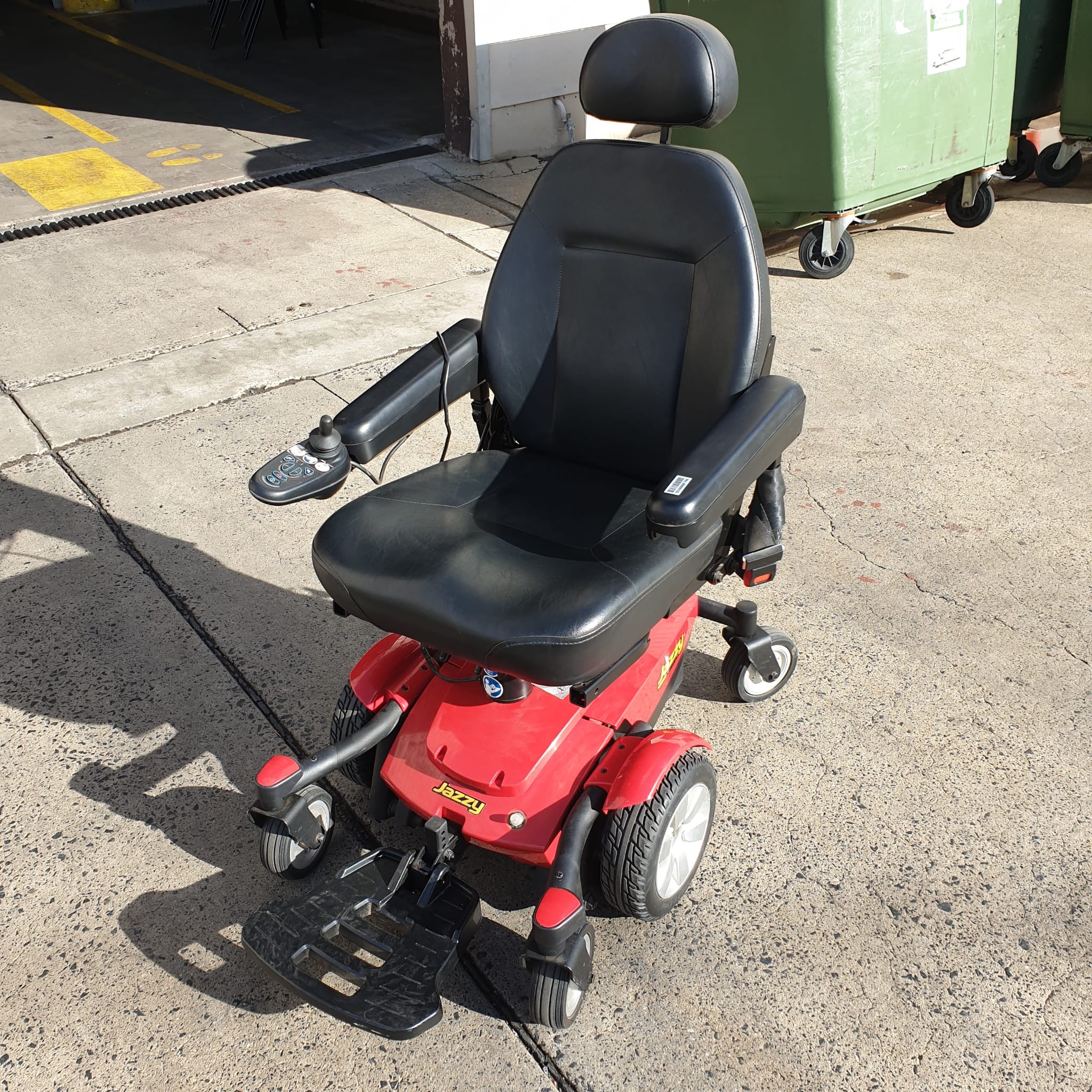 The Pride Jazzy Select Powerchair is a dependable mid‑wheel‑drive electric wheelchair designed for users needing stability, good indoor handling, and comfortable seating for daily mobility. This model features a red chassis, padded seat with headrest, adjustable armrests, and an off‑board EPS 2101 charger. Its compact frame and tight turning radius make it highly suitable for homes, aged‑care facilities, and community use.